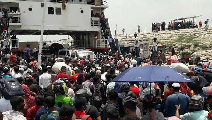 বিআইডব্লিউটিসিসহ ঘাট সূত্রে জানা যায়, কোনো বিধি নিষেধই মানতে চাইছেন না দক্ষিণাঞ্চলের যাত্রীরা। সকাল থেকে এ পর্যন্ত বাংলাবাজার ঘাট থেকে দুইটি ফেরি অ্যাম্বুলেন্সসহ জরুরি যানবাহন নিয়ে পার হয়। তবে যাত্রীদের চাপে জরুরি যানবাহন তোলা পুলিশ ও বিআইডব্লিউটিসিকে বেগে পড়তে হয়। সকাল থেকেই উভয় পাড়ে যাত্রী ও যানবাহনের প্রচণ্ড ভিড় শুরু হয়। বেলা বাড়ার সাথে যাত্রী ও যানবাহনে সয়লাব হয়ে যায় ঘাট এলাকা।