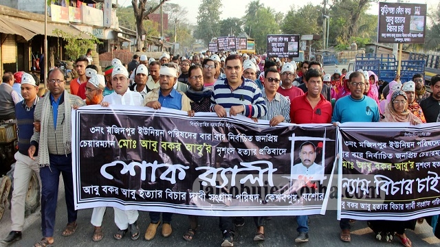 আজিজুর রহমান, কেশবপুর (যশোর) প্রতিনিধি: জাতীয় সংসদ নির্বাচনে যশোর-৬ কেশবপুর আসনে বিএনপির দলীয় মনোনয়ন প্রত্যাশী জেলা বিএনপির সহ-সভাপতি ও মজিদপুর ইউনিয়ন পরিষদের বারবার নির্বাচিত জনপ্রিয় চেয়ারম্যান আবু বকর আবুর হত্যার ন্যায় বিচারের দাবিতে সহস্রাধিক নারী পুরুষের বিভিন্ন ব্যানার-ফেস্টুন হাতে নিয়ে শহরের প্রধান প্রধান সড়কে মৌণ মিছিল করে। রবিবার বিকেলে কেশবপুর কলেজ গেট থেকে কালো ব্যাচ বুকে বেঁধে মৌন মিছিল প্রদক্ষিণ শহরের বিভিন্ন সড়ক প্রদক্ষিণ শেষে কেশবপুর ওয়াপদার গেচে শেষ হয়।