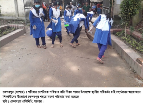 আজিজুর রহমান, কেশবপুর (যশোর) প্রতিনিধি: দেশটাকে পরিস্কার করি দিবস পালনে কেশবপুরের পরিবর্তন চাই সংগঠনের আয়োজনে শনিবার সকালে ছাত্রছাত্রীরা সারা শহরে ময়লা পরিস্কার করেছে।