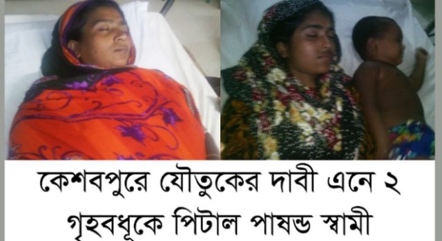 আজিজুর রহমান, কেশবপুর (যশোর) প্রতিনিধি: কেশবপুরে যৌতুকের দাবী এনে ২ গৃহবধূকে পিটিয়ে গুরুত্বর রক্তাক্ত জখম করেছে পাষ- স্বামী বলে অভিযোগ উঠেছে। গুরুত্বর রক্তাক্ত জখম ২ গৃহবধূ কেশবপুর হাসপাতালে ভর্তি করা হয়েছে।