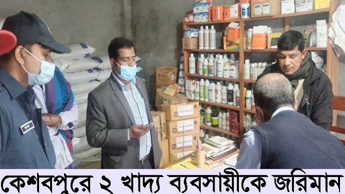 কেশবপুরে মৎস্য ও পশু খাদ্য বিক্রির বৈধ কাগজপত্র না থাকার অপরাধে ভ্রাম্যমাণ আদালত দুই ব্যবসায়ীকে অর্থদন্ড প্রদান করেছেন। রবিবার বিকালে উপজেলা নির্বাহী অফিসার ও নির্বাহী ম্যাজিস্ট্রেট এম এম আরাফাত হোসেন ভ্রাম্যমাণ আদালত পরিচালনা করেন।উপজেলা নির্বাহী অফিসারের কার্যালয় সূত্রে জানা গেছে, উপজেলা নির্বাহী অফিসার ও নির্বাহী ম্যাজিস্ট্রেট এম এম আরাফাত হোসেন রবিবার বিকালে উপজেলার আওয়ালগাঁতী বাজারে মৎস্য ও পশু খাদ্য বিক্রির বৈধ কাগজপত্র না থাকার অপরাধে ভ্রাম্যমাণ আদালত পরিচালনা করে মৎস্য ও পশু খাদ্য ব্যবসায়ী মিজানুর রহমানকে ১০ হাজার এবং আবুল কালামকে ৫ হাজার টাকা অর্থদন্ড প্রদান করেন।