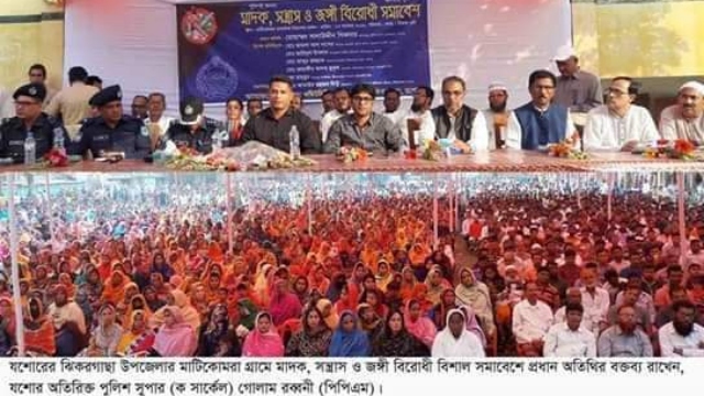 মিলন কবির, ঝিকরগাছা (যশোর) প্রতিনিধি : “পুলিশই জনতা জনতাই পুলিশ” এই শ্লোগানকে সামনে নিয়ে যশোরের ঝিকরগাছায় মাদক-সন্ত্রাস ও জঙ্গী বিরোধী সমাবেশ অনুষ্ঠিত হয়েছে। শনিবার বিকালে উপজেলার মাটিকোমরা মাধ্যমিক বিদ্যালয় প্রাঙ্গণে উক্ত সমাবেশ অনুষ্ঠিত হয়েছে।