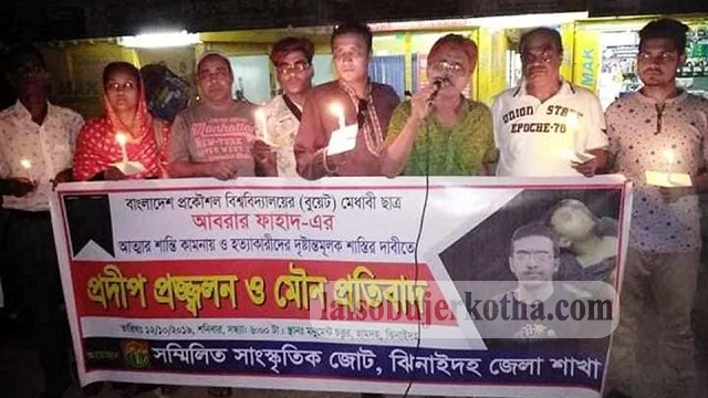 সাহিদুল এনাম পল্লবঃ রোজ শনিবার সন্ধ্যা ৬ টায় ঝিনাইদহ জেলা সম্মিলিত সাংস্কৃতিক জোট বাংলাদেশ প্রকৌশল বিশ্ববিদ্যালয়ের (বুয়েট) মেধাবী ছাত্র আবরার ফাহাদ -এর আত্মার শান্তি কামনা ও হত্যাকারীদের দৃষ্টান্তমূলক শাস্তির দাবীতে,হামদহ মনুমেন্ট চত্বরে “প্রদীপ প্রজ্জ্বলন ও মৌন প্রতিবাদের ” আয়োজন করে। প্রদীপ প্রজ্জ্বলন ও মৌন প্রতিবাদ মানব বন্ধনের উদ্বোধন করে সম্মিলিত সাংস্কৃতিক জোটের ঝিনাইদহ জেলার প্রধান উপদেষ্টা বিশিষ্ট শিক্ষাবিদ,প্রগতিশীল সংগঠক খোন্দকার হাফিজ ফারুক।
