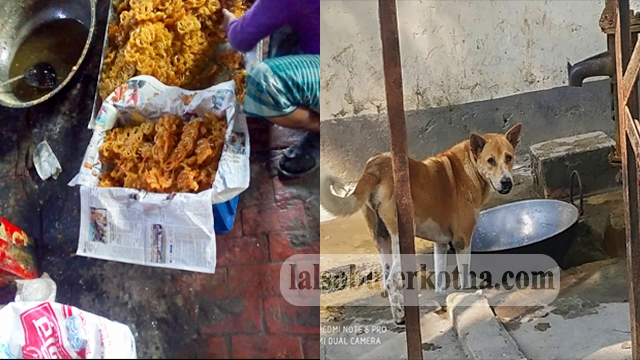 নগরঘাটা পোড়ার বাজারের একটা হোটেলের পিছনে গিয়ে দেখা যায় মিষ্টি তৈরির কড়াই কুকুর চেটে চেটে খাচ্ছে।