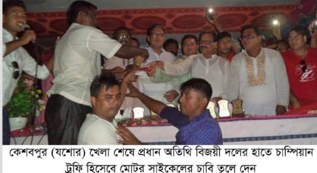 আজিজুর রহমান, কেশবপুর (যশোর) প্রতিনিধি : কেশবপুরের পাঁজিয়ায় শহীদ মুক্তিযোদ্ধা স্মৃতি সংসদের উদ্যাগে ১৬ দলীয় শেখ রাসেল স্মৃতি সংসদ ফুটবল টুর্নামেন্টের ফাইনাল খেলা অনুষ্ঠিত হয়েছে। শুক্রবার পাঁজিয়া কালিবাড়ি মাঠে এ খেলায় কৃষ্ণনগর মধুবাবু ফুটবল একাদশ ট্রাইবেকারে তালা সেন্টমেরি স্পোটিং ক্লাব ফুটবল একাদশকে ৫-৪ গোলে পরাজিত করে চ্যাম্পিয়ন হয়।