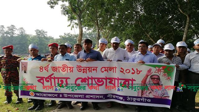 বৃহস্পতিবার সকালে উপজেলা প্রশাসনের আয়োজনে একটি বর্ণাঢ্য শোভাযাত্রা পীরগঞ্জ পাইলট উচ্চ বিদ্যালয় থেকে বের হয়ে উপজেলা পরিষদ চত্ত্বরে গিয়ে শেষ হয়। এ সময় উন্নয়ন মেলার উদ্বোধনী অনুষ্ঠানে উপস্থিত ছিলেন, সাবেক এমপি ইমদাদুল হক, উপজেলা চেয়ারম্যান জিয়াউল ইসলাম জিয়া, উপজেলা নির্বাহী অফিসার এ ডব্লিউ এম রায়হান শাহ, উপজেলা আ’লীগের সাধারণ সম্পাদক আখতারুল ইসলাম, পৌর মেয়র কশিরুল আলম, পীরগঞ্জ থানার অফিসার ইনজার্চ বজলুর রশিদ প্রমূখ।
