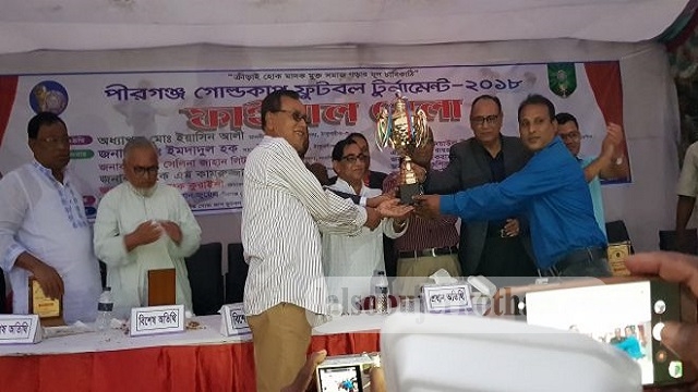 মোঃ নয়ন হোসাইন, পীরগঞ্জ (ঠাকুরগাঁও) প্রতিনিধিঃ ক্রীড়ায় হোক মাদক মুক্ত সমাজ গড়ার মুল চাবিকাঠি”এ স্লোগানকে সামনে চতুর্থ বারের মত ঠাকুরগাঁওয়ের পীরগঞ্জ পাবলিক ক্লাব মাঠে পীরগঞ্জ গোল্ডকাপ ফুটবল টুর্নামেন্ট-২০১৮’এর ফাইনাল খেলাটি আজ শুক্রবার বিকাল ৪ টায় পীরগঞ্জ পাবলিক ক্লাব মাঠে অনুষ্ঠিত হয়েছে।
