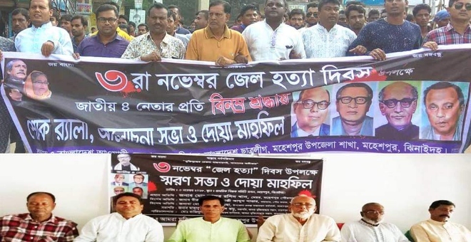 সেলিম রেজা,মহেশপুর (ঝিনাইদহ) প্রতিনিধি : ঝিনাইদহের মহেশপুরে ৩ নভেম্বর “জেল হত্যা” দিবস উপলক্ষে স্মরন সভা ও দোয়া মাহফিল অনুষ্ঠিত হয়েছে।