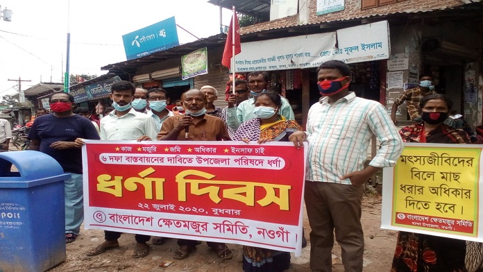 মাহবুবুজ্জামান সেতু, নওগাঁ প্রতিনিধিঃ নওগাঁর মান্দায় বাংলাদেশ ক্ষেতমুজুর সমিতি মান্দা উপজেলা শাখার আয়োজনে ধর্ণা দিবস পালিত হয়েছে। বুধবার দুপুর ১২ টায় ৬ দফা বাস্তবায়নের দাবিতে উপজেলার প্রসাদপুর বাজারের তিনমাথার মোড়ে এ ধর্ণা দিবস কর্মসূচী পালিত হয়।