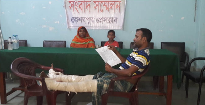 আজিজুর রহমান, কেশবপুর (যশোর) প্রতিনিধি : কেশবপুরে লাভলু বাহিনীর হাতে নির্মম নির্যাতনে যুবলীগ কর্মী সাজ্জাত হোসেনের দু‘পা ভেঙে পঙ্গু হয়ে গেছে। ওই পরিবারের একমাত্র উপার্জনক্ষম ব্যক্তি পঙ্গু হওয়াই বর্তমান তারা মানবেতর জীবন যাপন করছে। ওই বাহিনীর হাতে পাঁজিয়া এলাকার পর্যায়ক্রমে ২০ আওয়ামীলীগ নেতাকর্মী মারপিটের শিকার হয়ে অনেকেই এলাকা ছেড়ে ভয়ে রাত্রি যাপন করছে। এরপরও থেমে নেই ওই বাহিনীর তান্ডব। শনিবার দুপুরে কেশবপুর প্রেসক্লাবে এক সংবাদ সম্মেলনে পঙ্গু যুবলীগ কর্মী সাজ্জাত হোসেন আকুতির সাথে লাভলু বাহিনীর অত্যাচারের এ কাহিনী বর্ণনা করতে গিয়ে কেঁদে ফেলেন।